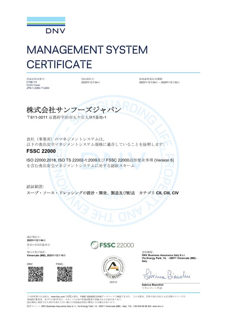 それに先立ち、2007年に食品安全マネジメントシステムに関する国際規格であるISO22000の認証を取得し、その後、食品の安全を遵守してまいりました。